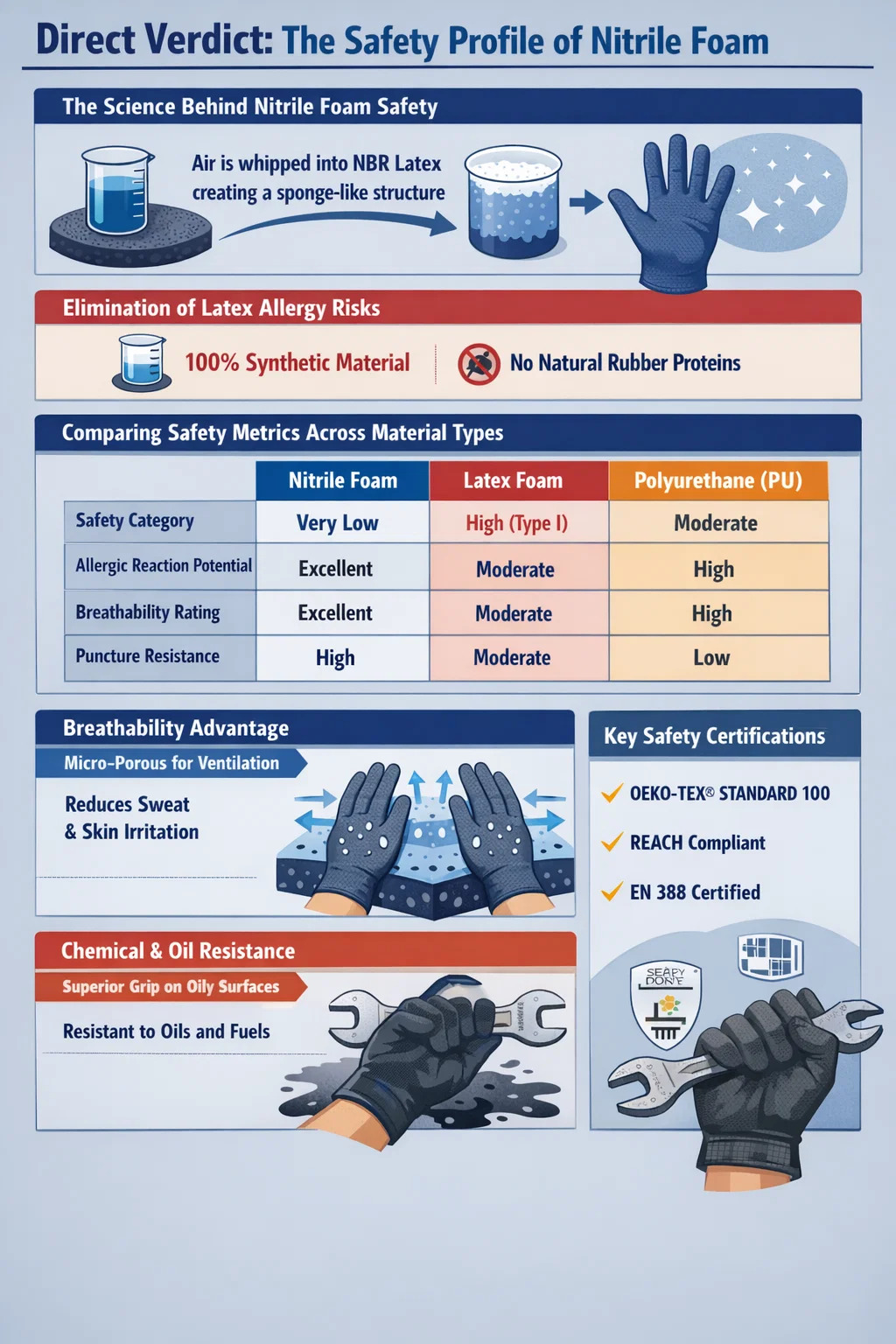 Forstå sikkerheden ved nitrilskum kræver en sammenligning med andre gængse belægningsmaterialer som polyurethan (PU) eller latex. Tabellen nedenfor fremhæver, hvordan nitril skiller sig ud med hensyn til brugernes sundhed og beskyttelse.