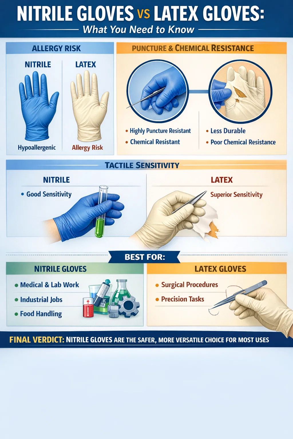 Når du vejer allergirisiko, punkteringsresistens, kemikalieresistens, holdbarhed og retningen af institutionel sundhedspolitik globalt, nitrilhandsker kommer frem som det sikrere, mere praktiske valg til det overvældende flertal af anvendelsestilfælde . Elimineringen af risikoen for latexallergi alene er overbevisende nok til, at de fleste sundhedsfaciliteter, fødevarevirksomheder og industrielle arbejdspladser kan standardisere på nitril.