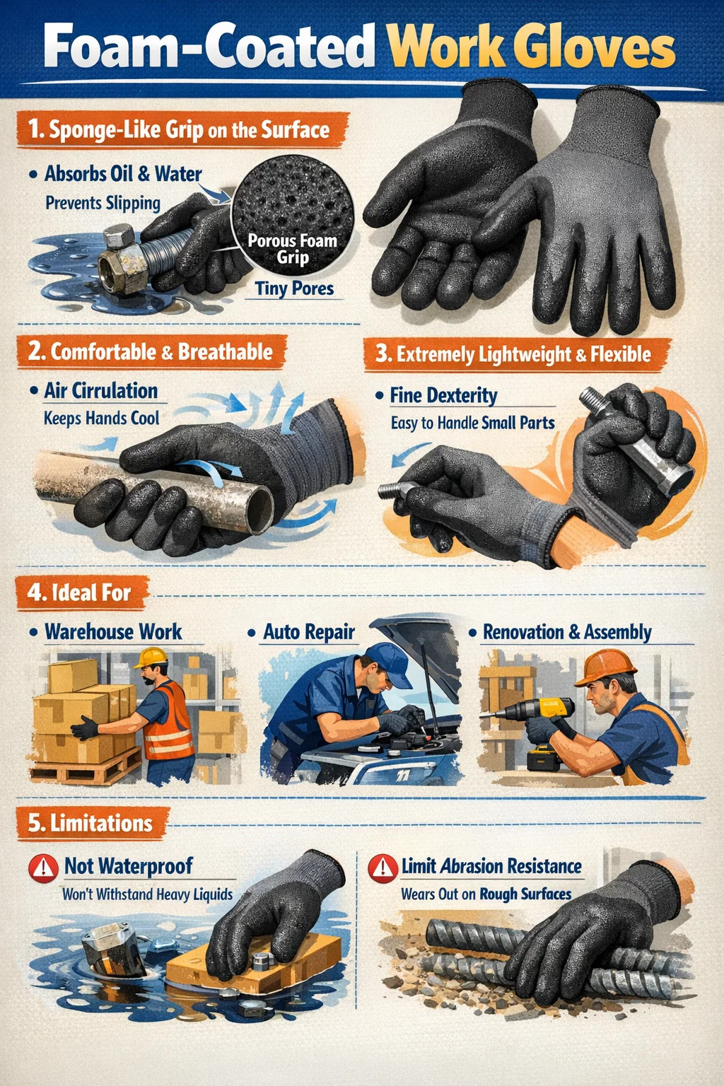 Luftcirkulation: Fordi belægningen er "skummet", kan luft cirkulere gennem de små porer. Sammenlignet med helt lukkede plastik- eller tykke gummihandsker er skumhandsker køligere og forhindrer hænderne i at blive klistrede.