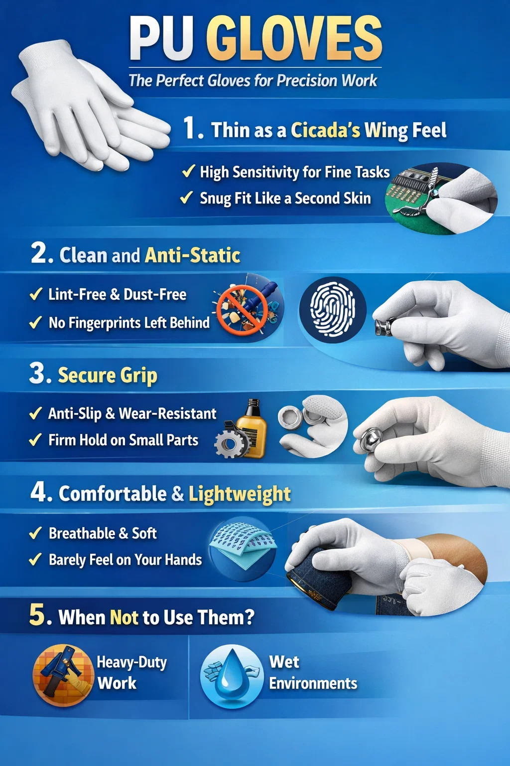 Antistatisk og støvfrit: Dette materiale i sig selv er ikke tilbøjeligt til at generere støv, hvilket gør det til det foretrukne valg til elektronikfabrikker og præcisionsinstrumenter. Hvis du reparerer en mobiltelefon, samler en computer eller renser dyre linser derhjemme, vil disse beskyttelseshandsker beskytte dine hænder uden at tilsmudse delene.