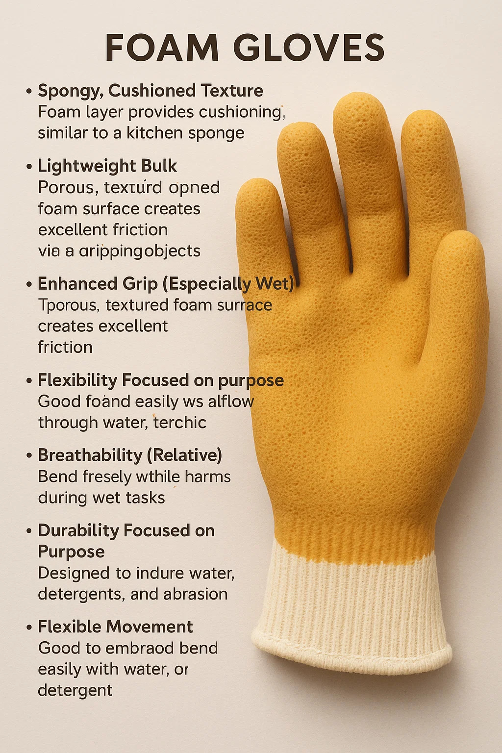 Skumhandsker er defineret af deres unikke materialestruktur og funktionelle træk. Her er deres vigtigste egenskaber:
