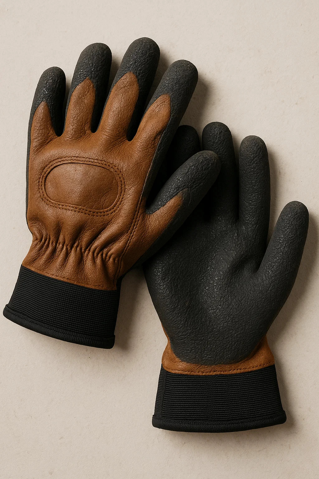 ▸Tunge læderhandsker til svejsning eller håndtering af træ.