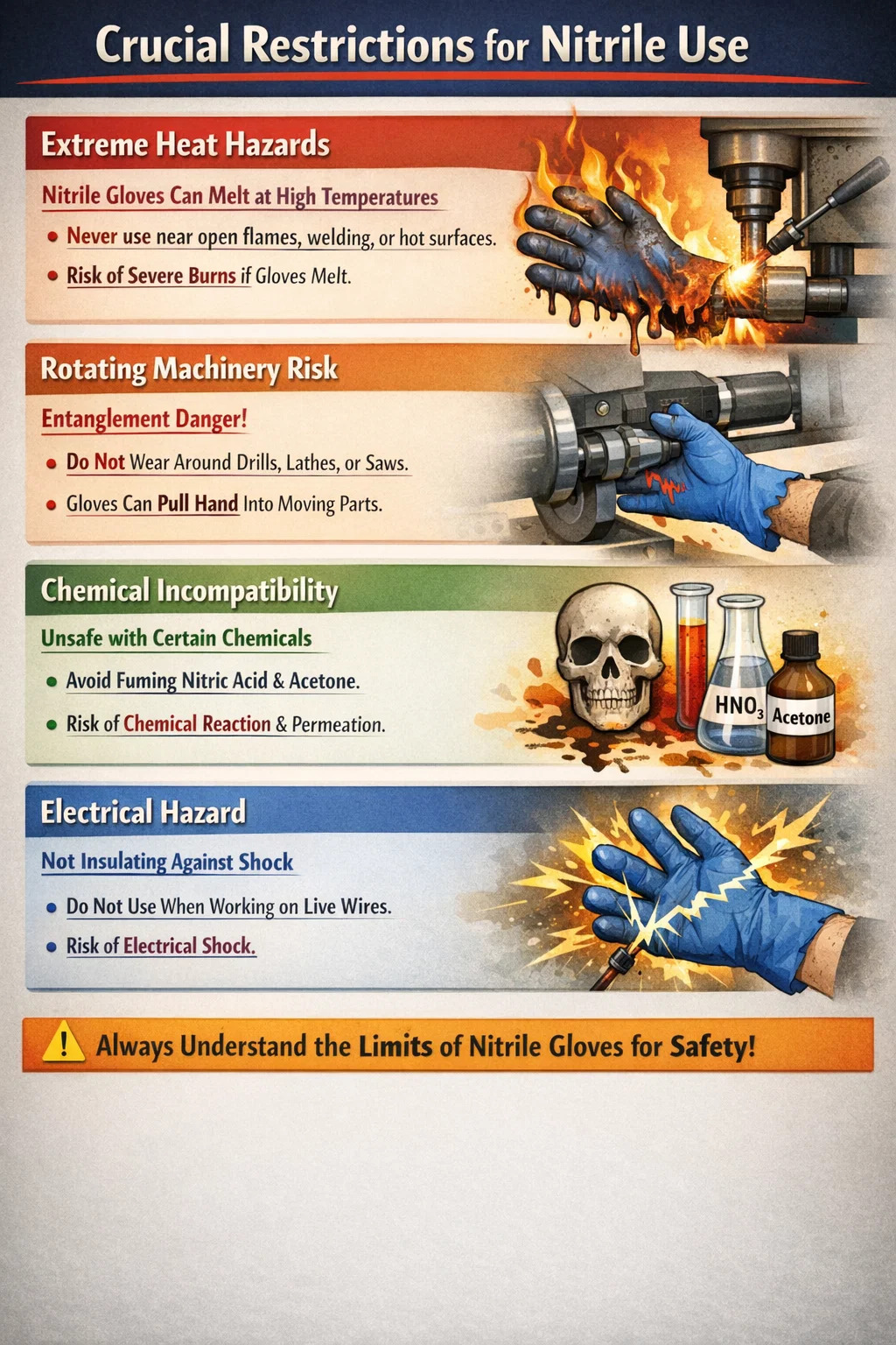 Mens nitril handsker er guldstandarden for mange brancher, bør du ikke bære dem, når du arbejder med åben ild, håndterer stærkt oxiderende syrer eller betjener roterende kraftmaskiner . Disse handsker er i det væsentlige en form for plastik (syntetisk gummi); de vil smelte og smelte sammen med din hud i scenarier med høj varme og mangler den "udbrudsstyrke", der er nødvendig for at forhindre din hånd i at blive trukket ind i en roterende motor eller drejebænk. At forstå disse grænser er afgørende for sikkerheden på arbejdspladsen.
