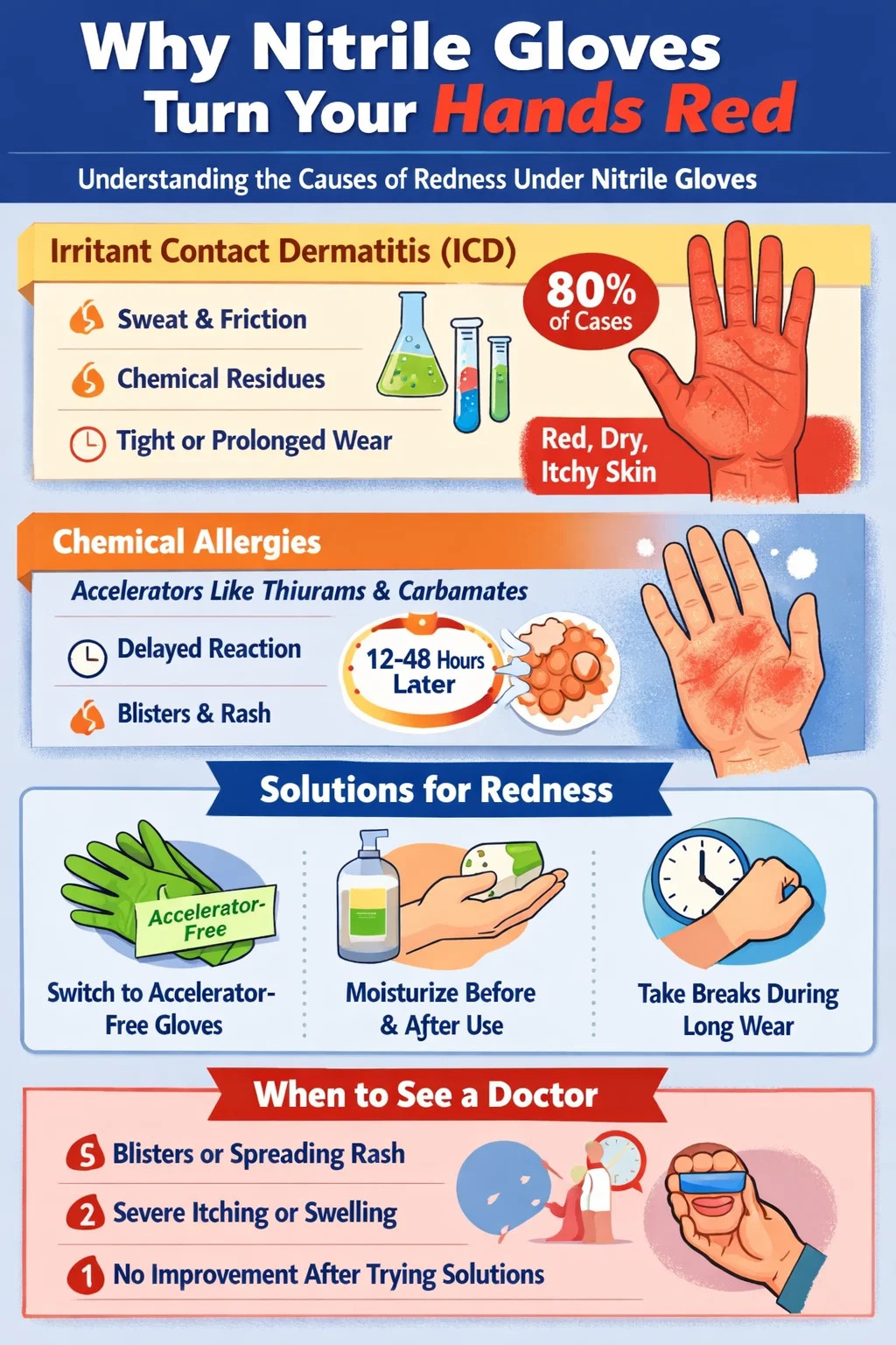 If your hands turn red after wearing nitrile gloves, the most likely cause is irritant contact dermatitis — a non-allergic skin reaction triggered by friction, heat, sweat buildup, or residual chemicals on the glove surface. This accounts for roughly 80% of all glove-related skin complaints. A smaller portion of people experience a true allergic response, either to chemical accelerators used during the manufacturing process or, in rare cases, to the nitrile polymer itself. The redness can also result from something as simple as gloves that are too tight, worn too long, or not removed correctly.